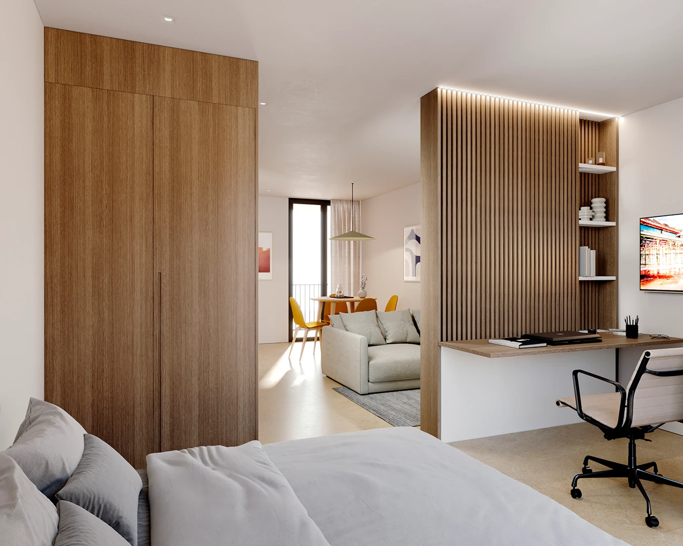 El edificio cuenta con una estructura que abarca 7 viviendas de una habitación distribuidas en planta baja, dos plantas intermedias y dos viviendas abuhardilladas Las distribuciones de las viviendas son idénticas, excepto en algunas unidades, donde destaca la incorporación de un balcón privado con vistas al jardín comunitario y piscina. En el caso de los áticos, estos disfrutan de un altillo que genera una segunda estancia unida a la primera planta por una escalera.